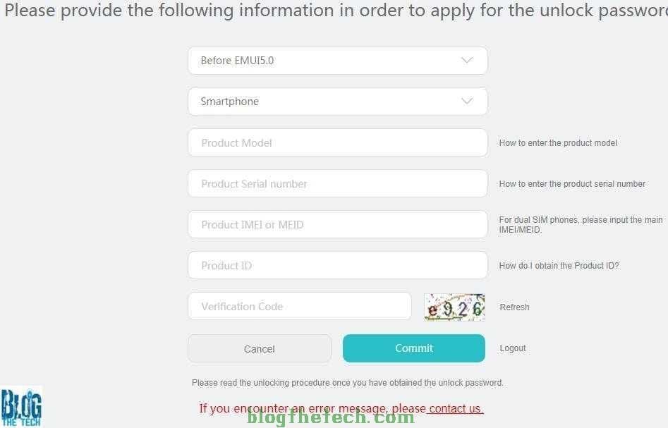 Fill everything correctly and commit.Huawei will send you a notification containing your unlocking code. You will be giving a 16-digit code. Go Fastboot and unlock your phone.To Unlock your phone, send this command